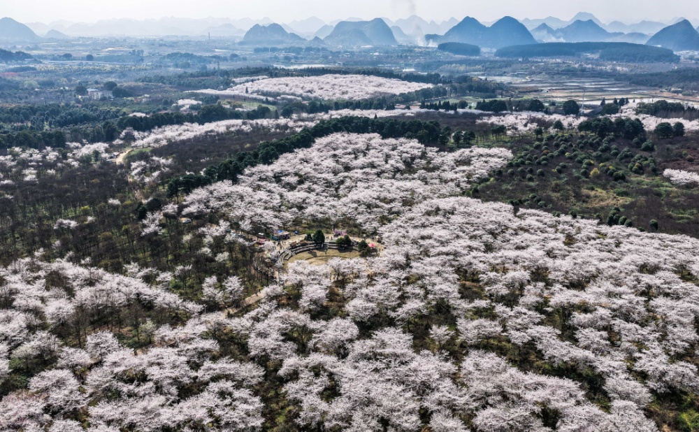 3月11日,游客在贵州省贵安新区樱花园内赏花游玩(无人机照片)。新华社记者 陶亮 摄