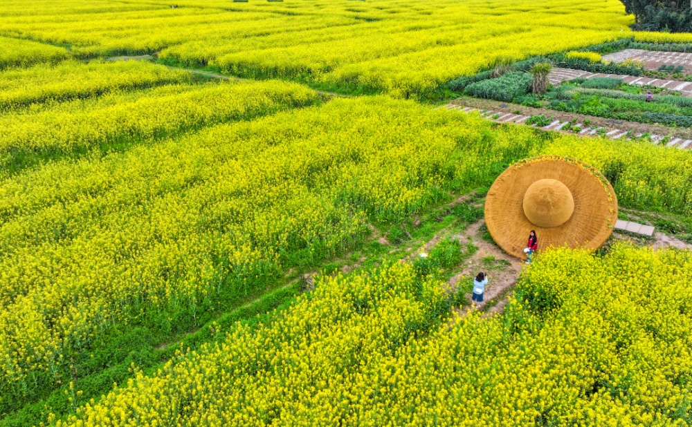 3月12日,游客在重庆潼南崇龛花海景区游览、拍照(无人机照片)。新华社记者 王全超 摄