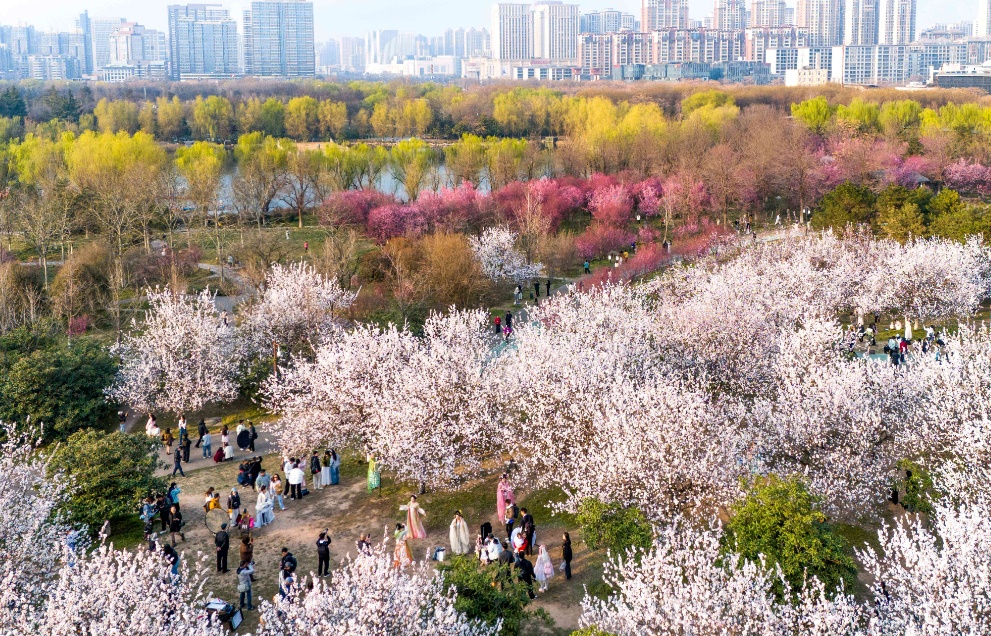 3月9日,游人在西安大明宫国家遗址公园赏花留影(无人机照片)。新华社记者 邹竞一 摄